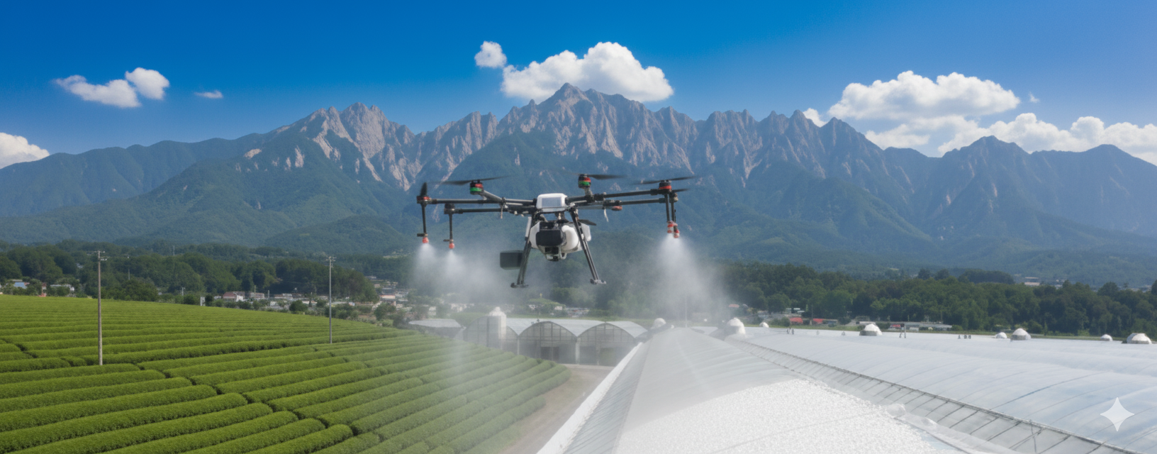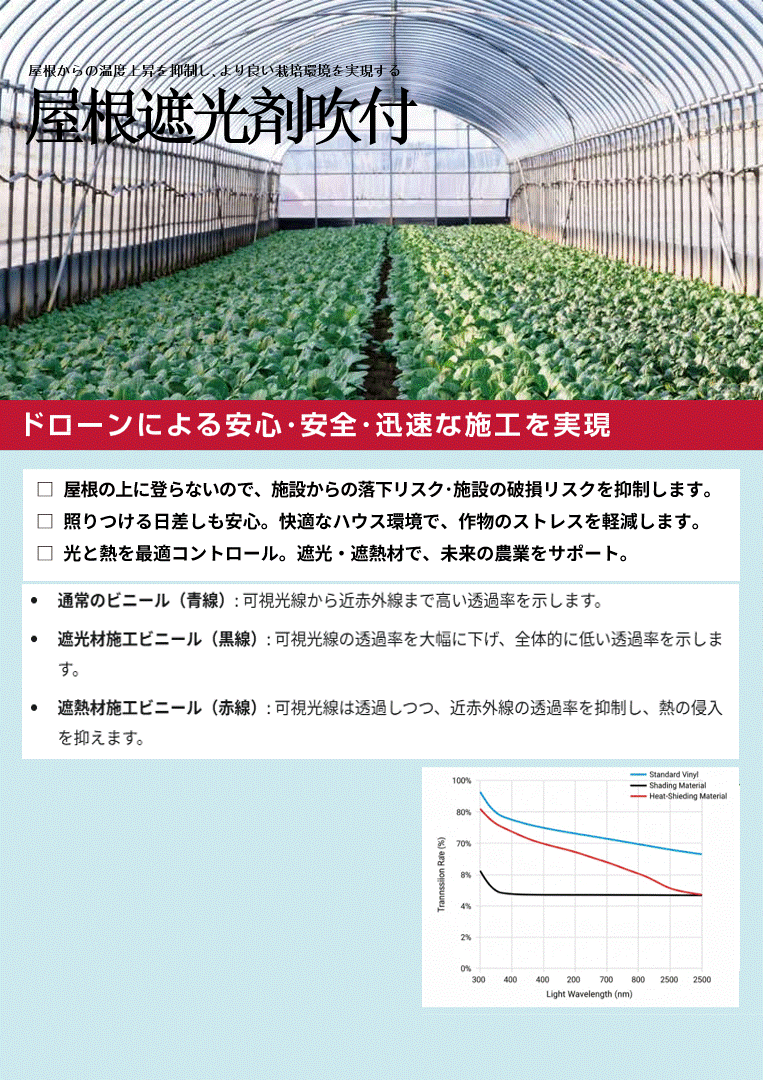 ドローンに搭載された高精度システムで、ハウス全体に遮熱材・遮光材をムラなく、均一に塗布します。